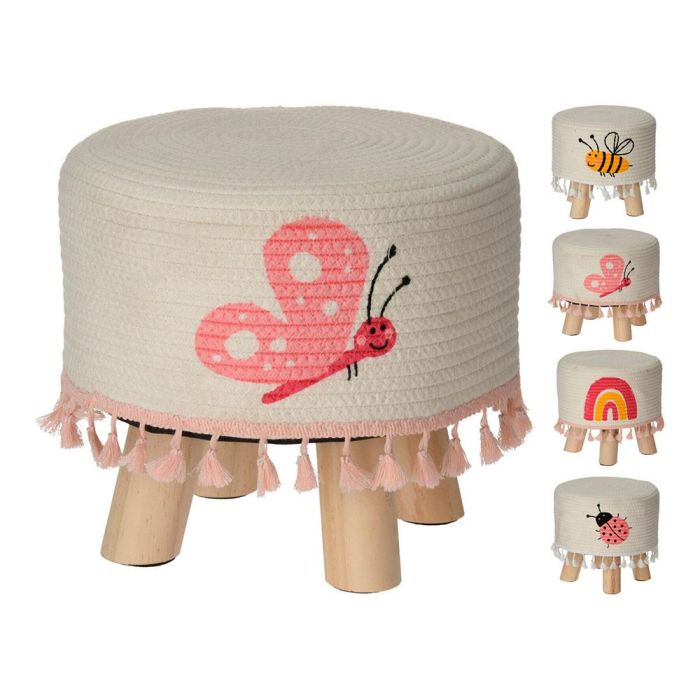 Home & Styling Taburete infantil con diseños de arco iris, ladybug, abeja y mariposa, blanco con flecos, Ø28x25mm