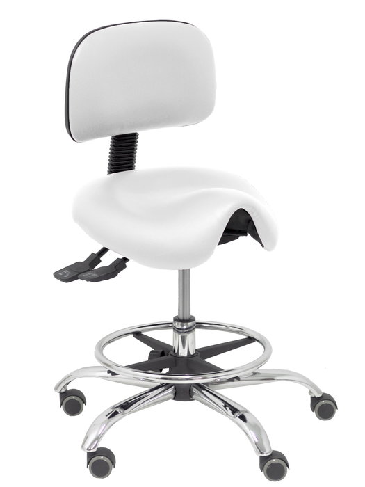 Taburete Zarza con mecanismo Asincro tapizada con Similpiel color Blanco. Equipado con Base cromada, Sin brazos y Ruedas de parqué