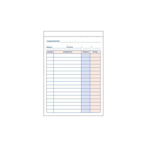 Talonarios preimpresos a dos tintas en papel autocopiativo y con 50 juegos de hojas. Bolsillo natural. Duplicado (original+copia).