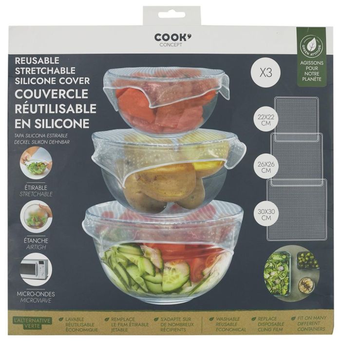 - Disponibles en 3 tamaños, se estiran para adaptarse a recipientes de diferentes tamaños, formas y materiales. Extensibles.
