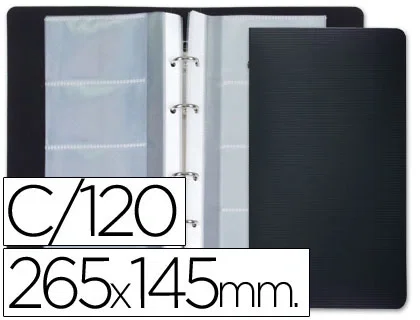 Portatarjetas en polipropileno con mecanismo metálico de 4 anillas. Contiene 15 fundas intercambiables con 4 departamentos cada una. Capacidad para 120 tarjetas. 8 tarjetas por hoja. Color negro. Medidas: 145 x 265 mm.