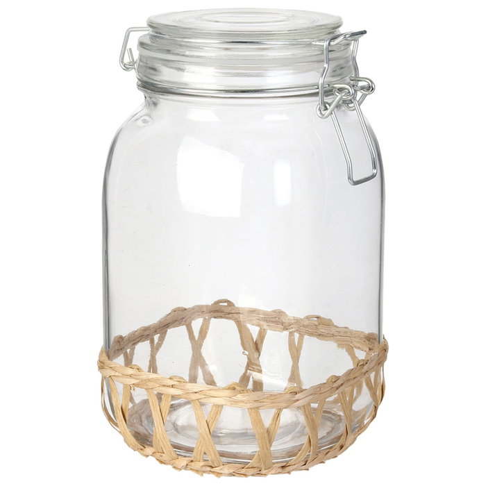 - Este bonito bote de vidrio y caña es ideal para guardar lo que quieras.