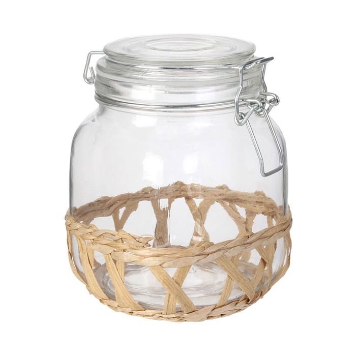 - Este bonito bote de vidrio y caña es ideal para guardar lo que quieras.
