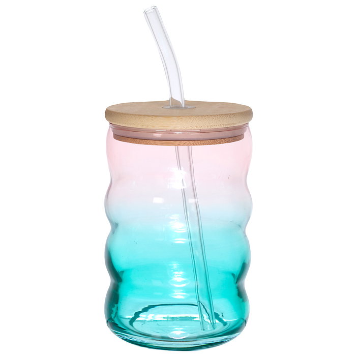 - Tarro de vidrio con tapa de bambú de formas redondeadas. Incluye pajita.