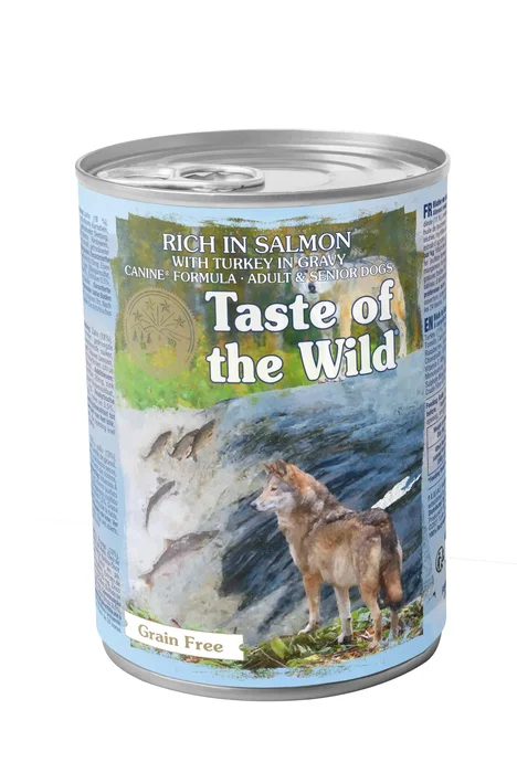 Alimento para perros adultos y senior Taste of the Wild Canine con salmón y pavo, en paquete de 12 unidades de 390 gramos cada una. Esta receta de alta calidad, elaborada por la reconocida marca Taste of the Wild, ofrece un equilibrio nutritivo ideal para las etapas adulta y senior de tu mascota.