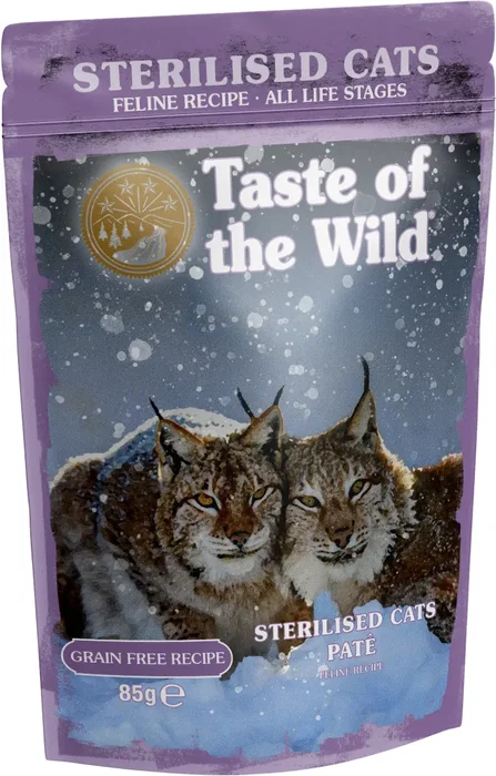 Taste of the Wild Feline Adult Sterilised Pate Pouch, una comida húmeda completa y equilibrada para gatos adultos esterilizados. Presentada en cómodas porciones de 85 gramos, este paquete contiene 12 sobres de paté de alta calidad. La receta, elaborada por la marca Taste of the Wild, está diseñada para satisfacer las necesidades nutricionales específicas de los gatos esterilizados, aportando un sabor delicioso que tu mascota adorará.