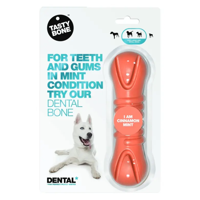 El Tasty Bone Dental Canela Menta es un innovador juguete diseñado para promover la salud bucal de tu perro mientras se divierte. Su fórmula única con sabor a canela y menta no solo lo hace irresistible para tu mascota, sino que también ayuda a combatir el mal aliento y a mantener sus dientes limpios. Fabricado por Tasty Bone, una marca reconocida por la calidad y durabilidad de sus productos, este hueso dental está pensado para perros que disfrutan de masticar, ayudando a reducir la acumulación de sarro y placa. Disfruta viendo a tu perro entretenerse de forma segura y beneficiosa con el Tasty Bone Dental Canela Menta.