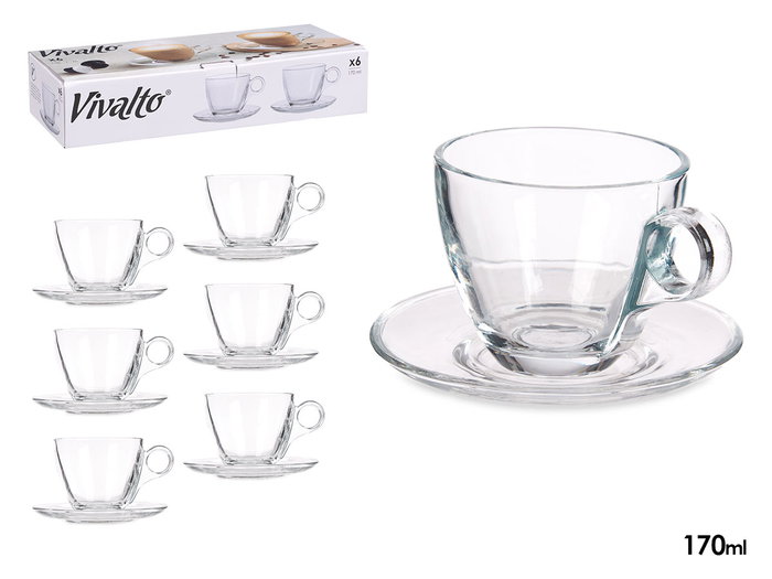 Vivalto Taza de Café de Vidrio 170ml con Plato 12.2x8x12.2cm Transparente (Set de 24)