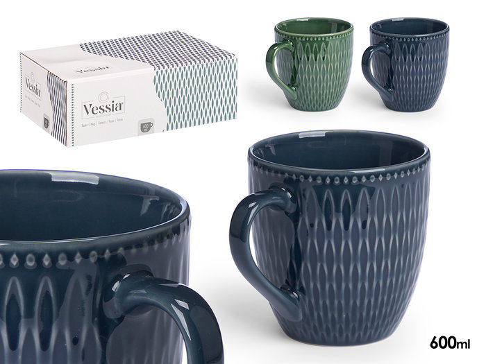 Vessia Tazon Desayuno Ceramica Loza 600 ml Colores Oscuros Azul y Verde 15 x 11.5 x 11 cm (Set de 24)