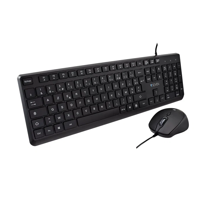 V7 CKU350ES Combo Teclado Español y Ratón USB, Teclado alámbrico perfil bajo silencioso 107 teclas con teclas F multimedia, Ratón óptico ambidiestro 2500 DPI - Negro