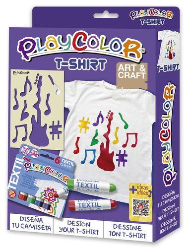 Diseña tu camiseta, es muy fácil, pon un cartón debajo de la superficie del tejido a decorar, manteniéndolo tenso y sin arrugas, pinta tu dibujo y decóralo a tu gusto. Una vez seco, coloca un papel en cada cara del dibujo y pasa la plancha caliente durante tres o cuatro minutos para fijarlo. ¡Listo! Ya tienes tu nueva camiseta estampada que podrás lavar sin problemas con programas inferiores a 60ºC. Contenido: 6 colores surtidos playcolor textil + camiseta + plantilla adhesiva.