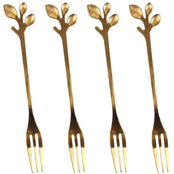 - Original set de 4 tenedores de postre dorados con formas de hojas en el extremo.