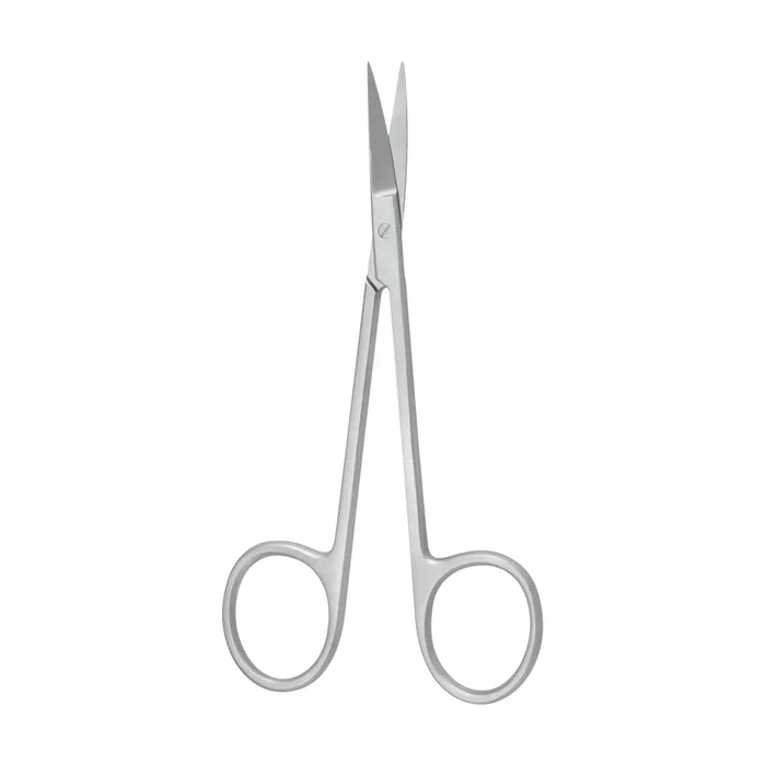 Tijera oftálmica de uso general, curva, de la marca Covetrus. Esta tijera ligera de acción estándar está diseñada para intervenciones en la conjuntiva y la córnea. Disponible en diferentes tamaños para adaptarse a diversas necesidades quirúrgicas.