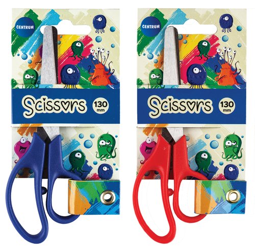 Tijeras escolares de 130 mm con puntas redondas y empuñadura plástica asimétrica. Aptas para cortar papel, cartulina, hilos u otros papeles de manualidades.