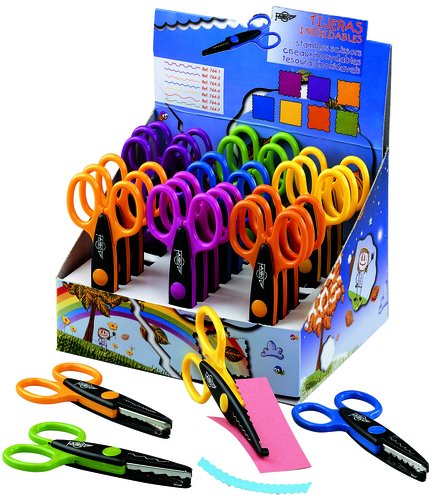 Tijeras dentadas de 130 mm en siete colores y formas diferentes para papel, cartulina, cartón o cualquier otra manualidad a la que quieras dar un estilo diferente.