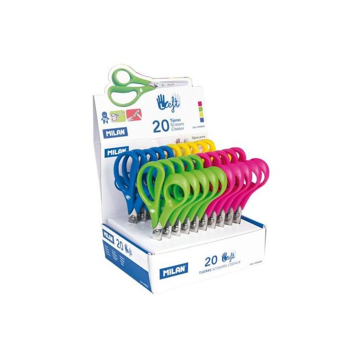 Tijeras para zurdos con cuchilla de acero inoxidable y punta redondeada. Mango de plástico. Ideal para uso escolar. Colores surtidos: azul, amarillo, verde y rosa. 14 cm.