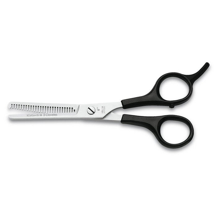 Tres Claveles Tijera Peluquería Scuola ES-28 Esculpir 6" Negra Acero Inoxidable Mango Nylon con Apoyadedos y Tope Silenciador