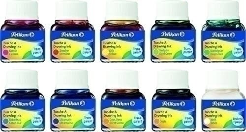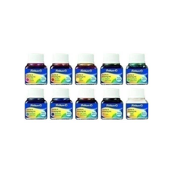 Tinta China Pelikan Frasco 10 Ml. Surtido De 10 Colores (249474) (Carmín, Bermellón, Amarillo, Verde Claro, Verde Oscuro, Azul Cobalto, Azul Ultramar, Siena, Sepia Y Blanco) (Set de 10)