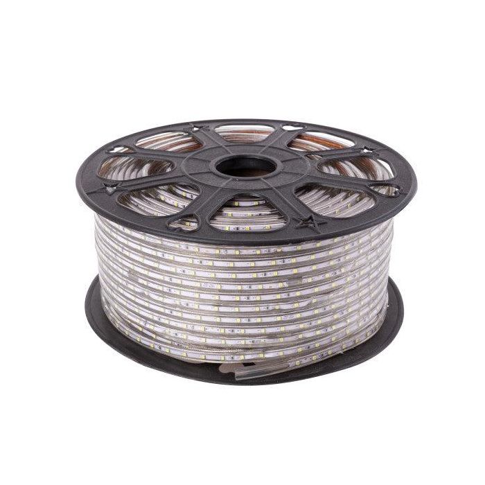 El Rollo de Tiras LED se conecta directamente a la red eléctrica de 220V mediante un alimentador. Está fabricado con componentes de alta calidad, permite una alta disipación del calor y es impermeable gracias a la cubierta transparente de PVC. Mediante este rollo de tiras es posible hacer instalaciones de hasta 50 metros por alimentador, sin riesgo de caídas de tensión. No requiere transformadores, amplificadores ni adaptadores adicionales, consiguiendo grandes ahorros en materiales y mano de obra en comparación con las tiras LED de 12/24V. Se puede cortar cada metro, por lo que las tiras LED a 220V reducen significativamente la probabilidad de fallos, usan circuitos serie/paralelo, si se daña una zona (cada zona 1 metro) no afecta a las demás. Por su flexibilidad y alta luminosidad es ideal para crear una iluminación de calidad en todo tipo de ambientes, tanto en interiores como en exteriores. Ideal para la iluminación de: Iluminación de fachada, techos, residencias y todo tipo de decoración Puentes, monumentos, escaleras Iluminación espectacular, teatros, zonas exteriores Iluminación de emergencia, señalización de caminos Iluminación ambiental Iluminacion de vitrinas, luz comercial y escaparates Se suministra en un carrete de 100 metros No debe conectarse con la tira enrollada.