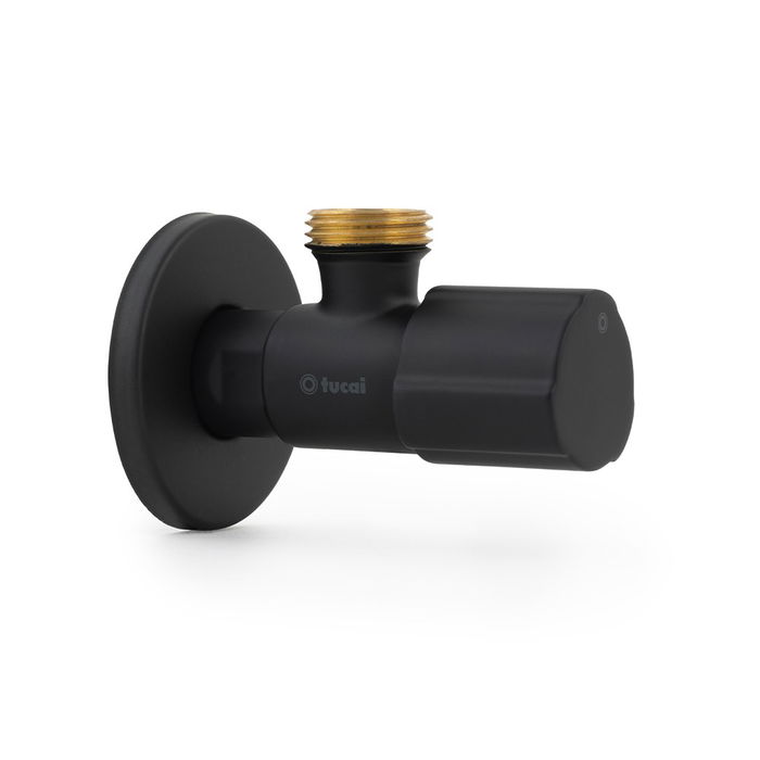 TMM Válvula Escuadra Cerámica de 1/2 x 3/8 Pulg, Mando Redondo Metálico 1/4 de Vuelta, Color Negro, Para Agua Potable, 16 Bar, 95°C