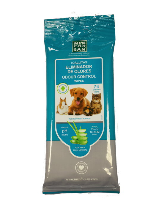 Men For San Toallitas Limpiadoras Eliminador Olores Talco para Perros, Gatos, Roedores y Hurones, 24 Toallitas