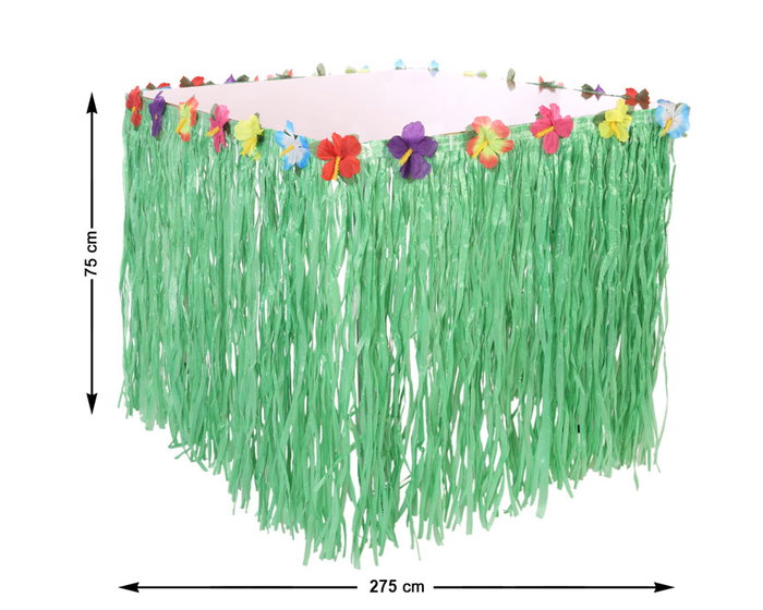 Transforma cualquier mesa en un rincón paradisíaco con este faldón decorativo de 275x75 cm. con tiras verdes tipo falda de hula y flores multicolor, es perfecto para celebraciones tropicales, fiestas temáticas hawaianas o cumpleaños veraniegos. crea un ambiente alegre y exótico en segundos.