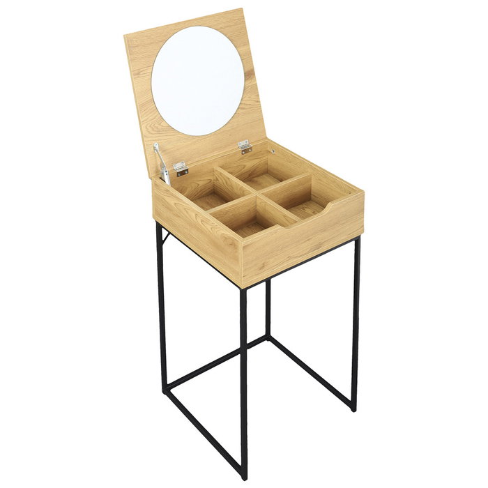 - Al abrirlo tiene un espejo redondo en la tapa y distintos compartimentos para accesorios y maquillaje.