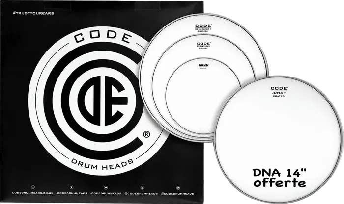 Estamos ante la serie más resistente de CODE y con muffle adherido a la superficie para un mayor control del sonido. Con este parche conseguiremos grandes armónicos, un ataque rápido pero profundo, así como un sustain muy corto. El sonido de los Generator Coated es muy suave, acentuando más las notas graves y menos brillante que los Generator Clear. Están disponibles también en Packs Fusion, Rock y Standard, con un parche adicional DNA+ Coated de 14? incluido en el set. Acabado: Blanco Rugoso Grueso: 2 capas de 7,5 mil Muffle adherido de superficie. Mayor control del sonido. Sonido: Abierto, cálido y controlable. Resonancia: Medida y controlada. Aplicaciones: Todo tipo de géneros. Uso para directo o estudio.