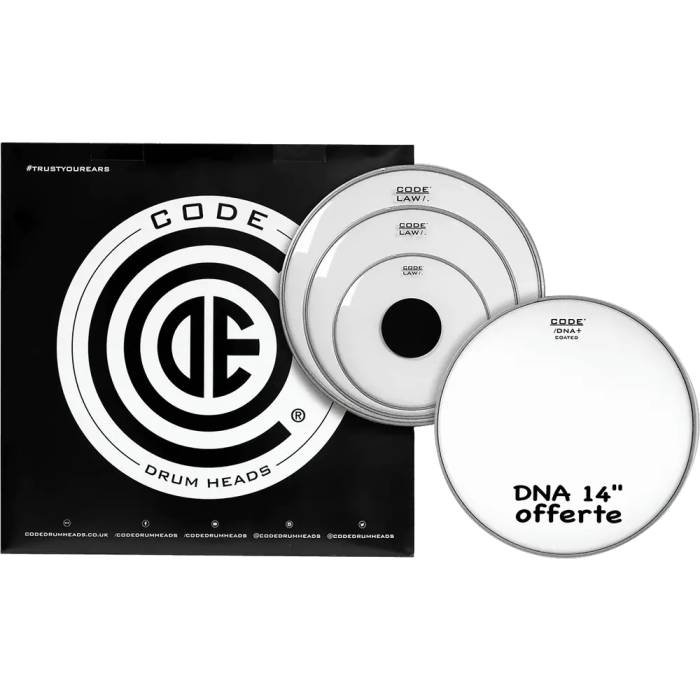 CODE Tom Pack Law Fusion Transparente (10,12,14" + DNA 14") Parches de Batería Sonido Vintage 70