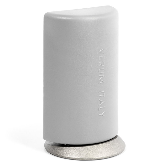 Tope de puerta de la marca italiana de accesorios para mueble Nuda. Este queda sujeto al suelo mediante una base sobre la que se coloca el soporte, que tiene la parte que entra en contacto con la puerta con forma semicircular.