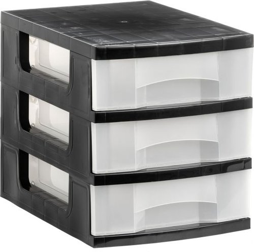 Torre de almacenaje sostenible de 3 cajones con 6 litros de capacidad. Fabricada en polipropileno copolímero 100% reciclado y reciclable, con aditivo antiestático que facilita la limpieza y evita la acumulación de polvo. Ideales para el hogar, la oficina, centros educativos, clínicas, hospitales, etc. Medidas interiores de los cajones: 342 x 220 x 79 mm. Medidas exteriores: 390 x 290 x 330 mm.