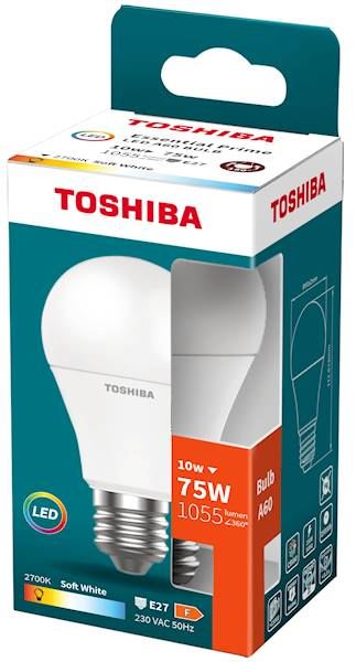 Bombilla LED TOSHIBA ESSENTIAL modelo A60 con casquillo E27. Ofrece una potencia de 10W y una temperatura de color cálida de 2700K, ideal para crear ambientes acogedores.