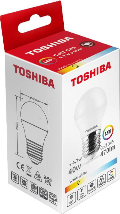 Descubre la bombilla LED G45 E27 de Toshiba. Ofrece 4.7W de potencia para un ahorro energético significativo, con una temperatura de color cálida de 3000K ideal para crear ambientes acogedores en tu hogar. Su diseño G45 con casquillo E27 garantiza una instalación fácil y compatible con la mayoría de los accesorios. Una opción duradera y eficiente de la marca líder Toshiba.