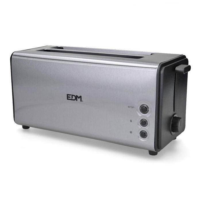 Tostadora de doble ranura larga. potencia 1400w. color cromado. superficie de toque frio. carcasa acero inoxidable. todos los botones con luz piloto. 5 posiciones de tostado. 4 funciones: tostar, recalentar, descongelar y detener. bandeja de migas extraible. cable de alimentación: aprox. 75cm. almacenamiento de cable. dimensiones: 37x15,5x18,5cm (ancho/fondo/alto) 220-240v 50/60hz edm