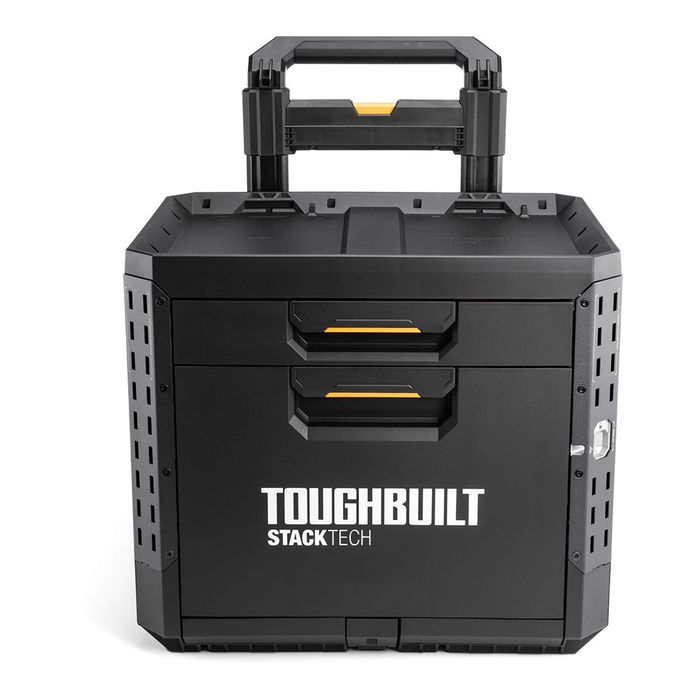 Caja de herramientas con ruedas de 2 cajones con cierre, stacktech, estructura autoalineable y encajable, acceso rápido al almacenamiento sin desapilar, la posición del cierre indica cuándo es seguro transportarla, cierre deslizante apto para candado (no incluido), asas laterales robustas y abatibles, rieles para complementos de liberación rápida, polímero de alto rendimiento negro y esquinas de acero, mango telescópico extraíble de 67 - 111,8 cm y 2 ruedas todoterreno de 22 cm, incluye 13 separadores, capacidad 113 kg, medida encajable 47 x 35,5 cm, dimensiones 53 x 40,5 x 47,7 cm