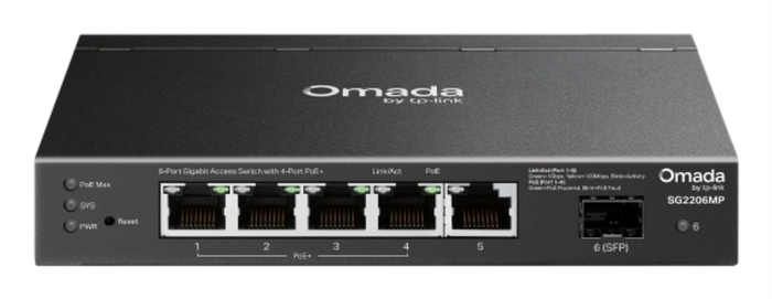 TP-Link SG2206MP Switch L2 Gigabit Ethernet con 5 Puertos RJ-45, 1 Puerto SFP y PoE, Montaje en Rack