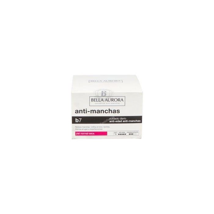 Descubre el tratamiento Bella Aurora B7 Antimanchas Regenerador Aclarante SPF15, una solución ideal para todo tipo de pieles que también combate los signos de la edad. Esta crema hidratante está especialmente formulada para atacar las manchas de pigmentación, favoreciendo su reducción y previniendo la aparición de nuevas imperfecciones, lo que resulta en un tono uniforme y una piel radiante.