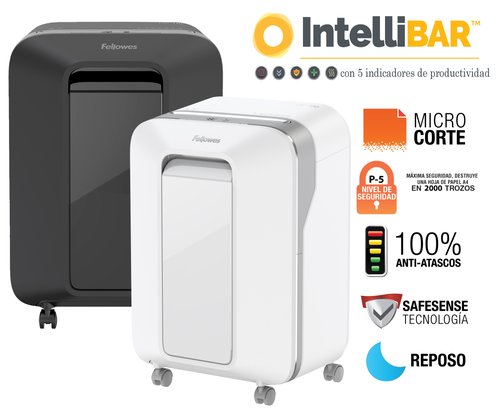 Destructora para casa u oficina con un rendimiento 100% anti-atascos, nivel 5 de seguridad, papelera de 22 litros, tecnología Intellibar con 5 indicadores de productividad (indica cuando se está llegando al límite de la capacidad de la papelera, las hojas que puede destruir, o cuando el ciclo de trabajo se está completando) y tecnología Safesense® que garantiza la máxima seguridad (se detiene automáticamente cuando detecta una mano en la boca de entrada del papel). Destruye tarjetas de crédito, grapas, clips y hasta 12 hojas de papel (de 70 gramos) en microcorte de 2x12mm. El modo reposo apaga automáticamente la destructora tras un periodo de inactividad. Medidas: 525 x 255 x 354 mm.