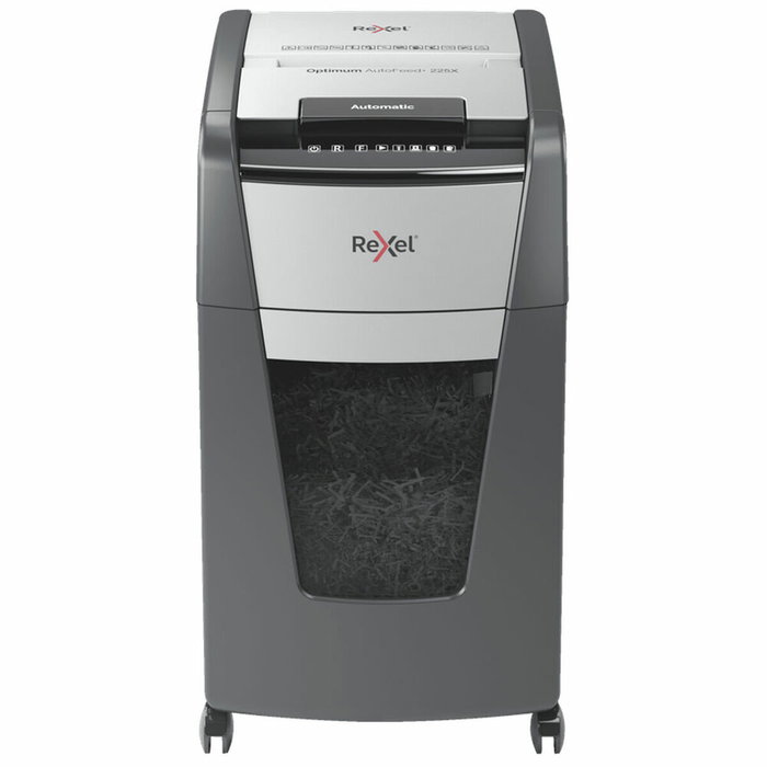 La destructora de corte en partículas Optimum AutoFeed 225X tritura automáticamente hasta 225 hojas de papel A4 (80 grs.) a la vez, en partículas P-4 (4x25 mm). Esta destructora de alimentación automática es una trituradora de oficina sofisticada, con una papelera extraíble de 60 litros. No es necesario alimentar manualmente el papel, ni quitar grapas y clips de papel primero, esta destructora de papel automática hará todo el trabajo por ti.