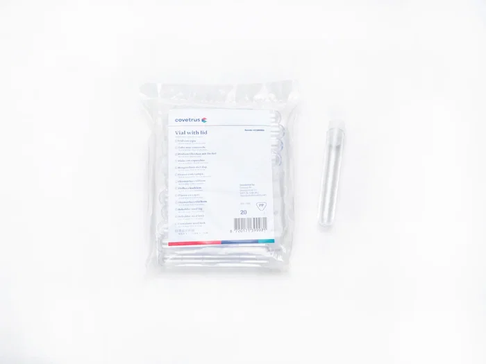 Vial con tapa de la marca Covetrus. Este producto tiene una capacidad de 16ml y una longitud de 10cm. Es no estéril y se presenta en un formato práctico de 20 unidades por bolsa.