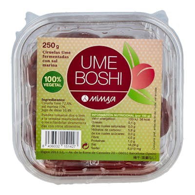 Composicion: Ciruela umé 72.6%, sal marina 17%, jugo de shiso 10,4% Valor nutricional por 100 g: Energía-Kj 153 Energía (kcal) 36 Proteínas (g) 1 Grasas (g) 0.1 Hidratos de carbono (g) 5.9 - Azúcares (g) Sodio (g) 0.006510