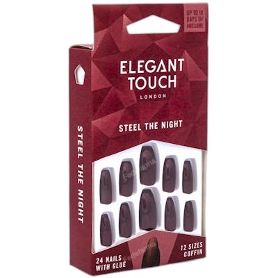 Elegant Touch POLISHED COLOUR Uñas Postizas Coffin con Pegamento, Tono #steel the night, 24 Unidades