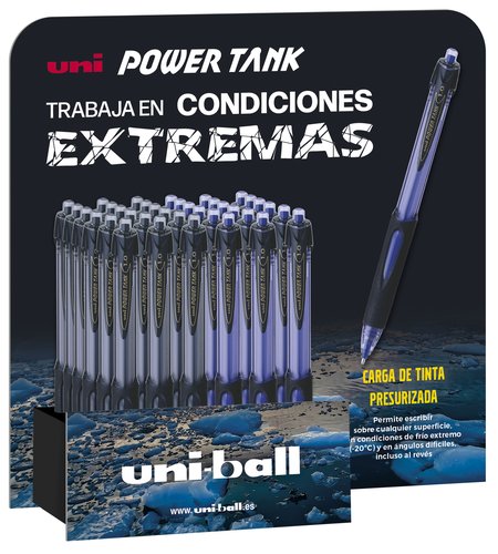 Bolígrafos retráctiles con punta de acero inoxidable, bola de 1 mm fabricada en carburo de tungteno, para trazos de 0.4 (aprox.), tinta a base de agua pigmentada (carga presurizada a 3000hPa, que permite escribir sobre cualquier superficie). Medidas expositor: 220 x 230 mm.