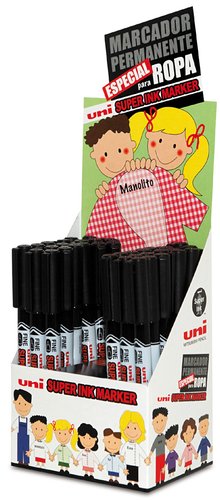 Marcador con cuerpo de plástico (PP) reciclado, tinta pigmentada base aceite y punta acrílica en forma de bala que deja un trazo de 0,9 mm. Un marcador con tinta Uni Super Ink ideal para escribir en la mayoría de las superficies, como vidrio, cartón, plástico, tela...
