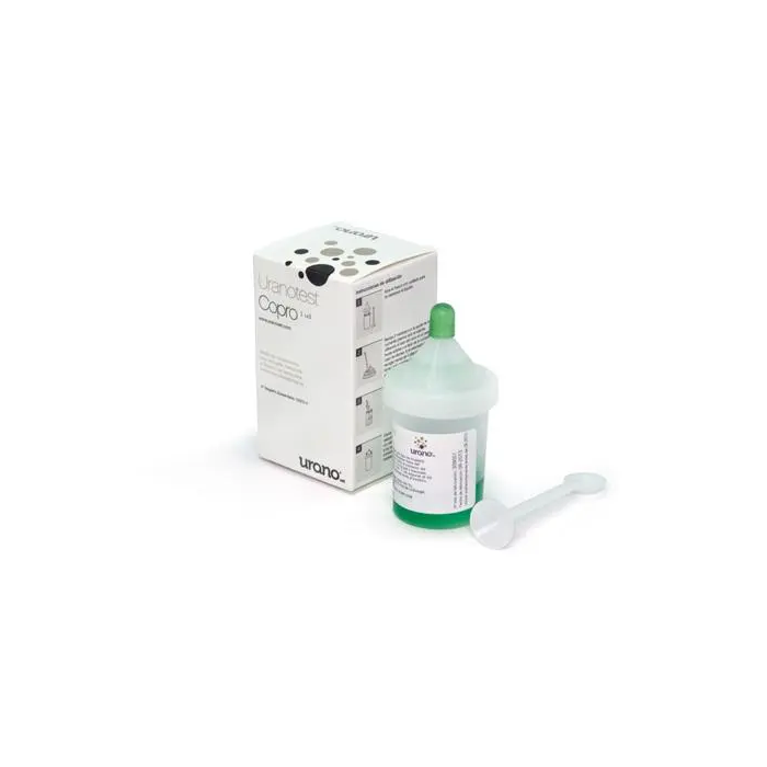- Frasco con conservante Greenfix® , no tóxico y no agresivo con el medio ambiente, que asegura la conservación e integridad de la muestra durante 15 días. El mismo frasco incorpora un filtro de 260 micras que deja pasar huevos, quistes y larvas y retiene las partículas gruesas, obteniéndose una muestra limpia apta para análisis microscópico. Sin olores ni manipulación de heces. Comodidad e higiene para el propietario y para el veterinario. Sin malos olores, ni manipulaciones de heces. La muestra de heces puede conservarse a temperatura ambiente hasta 15 días. Reduce significativamente el tiempo del diagnóstico y, por tanto, los costes para la clínica. El sistema empleado en Uranotest copro ha sido considerado como una de las 8 tecnologías más innovadoras por la OMS por su alto rendimiento en los exámenes parasitológicos y por facilitar la rutina del técnico de laboratorio.