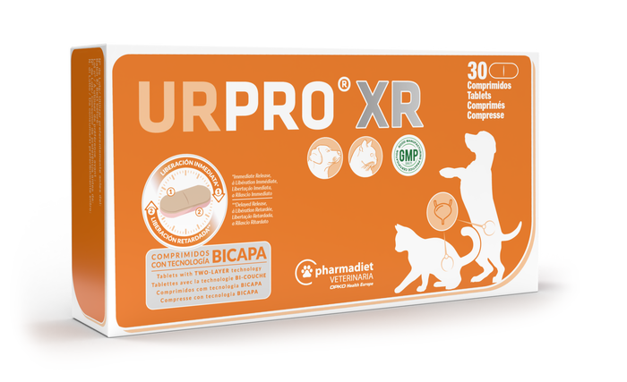 Alimento complementario para perros y gatos, en formato bicapa de liberación retardada, a base de nutrientes, que ayudan al correcto funcionamiento de todo el sistema urinario especialmente a nivel de tracto urinario inferior. Indicado para ayudar en infecciones del tracto urinario, agudas o recurrentes, disminuyendo la carga bacteriana, con el objetivo de reducir los tratamientos antibióticos.