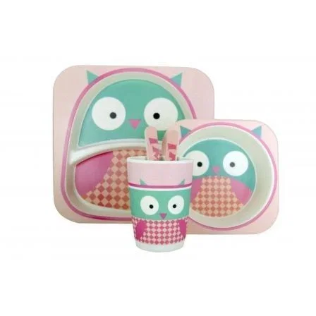 VAJILLA INFANTIL BÚHO JOCCA 1740B - FIBRA DE BAMBU - 2 PLATOS (21.3/14.1CM) - VASO - CUCHARA - TENEDOR