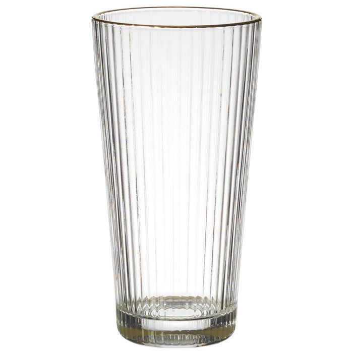 - Vaso transparente con textura acanalada y ribete dorado.