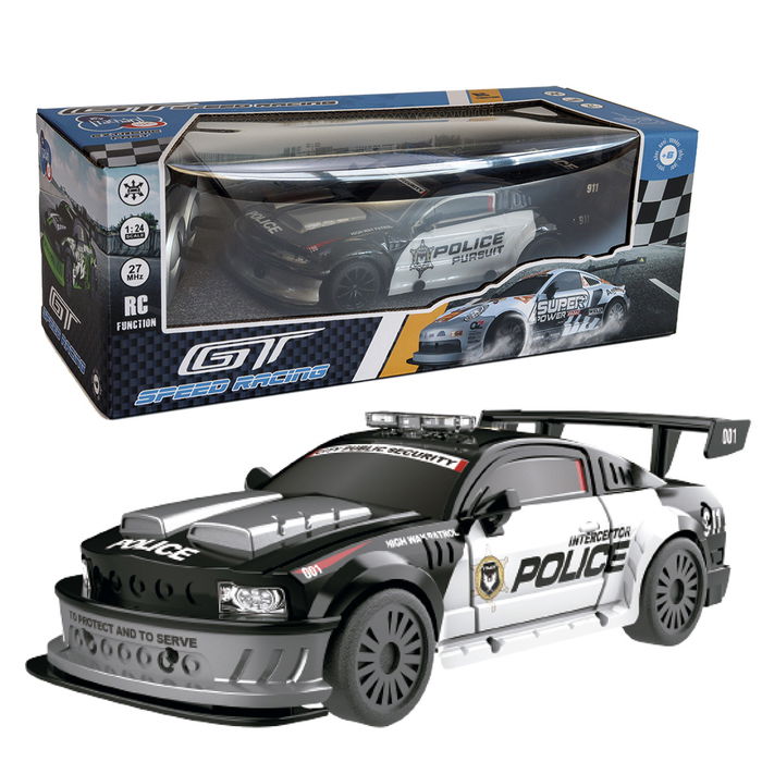 Vehículo policía radio control GT-Speed Racing a escala 1:24, frecuencia 27 MHz. Funciona con 3 pilas AA en el vehículo y 2 pilas AA en el mando, no incluidas.