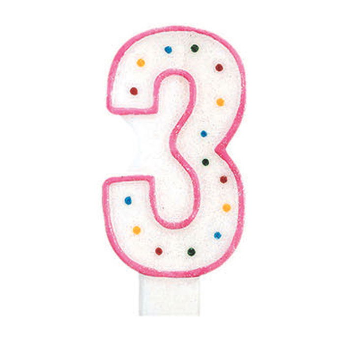 - Vela numeral con la cifra 3, decorada con círculos y con ribete de color.